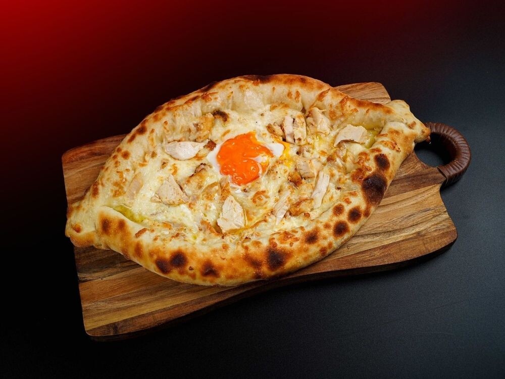 Ароматная лодочка из воздушного теста, наполненная тягучим сыром сулугуни, золотистым яйцом и сочными кусочками нежной курицы. Хрустящая корочка, тающая начинка — идеальный баланс сытности и легкости. Подаётся горячим: разламываешь края, макаешь в желток и наслаждаесь вкусом Кавказа в каждом кусочке!