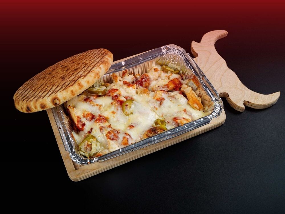 Это блюдо придётся по вкусу тем, кто любит сытную и сочную еду. Курица, приготовленная с фирменными соусами, приобретает яркий вкус и аромат. Вместе с картофелем фри, пряным халапеньо, свежими огурцами и помидорами, а также с сыром пармезан и моцарелла,запекается в пицца-печи и подается с Питой