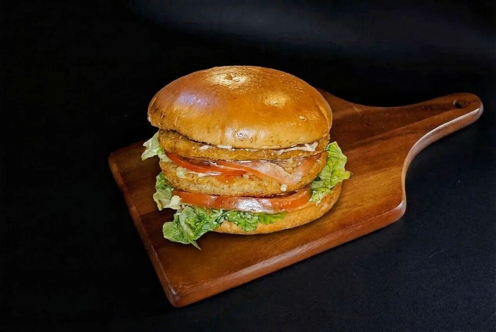 2 сочные,хрустящие куриные котлеты, пряный соус Цезарь, пармезан,томат и свежий салат в обрамлении мягкой булочки Бриошь .