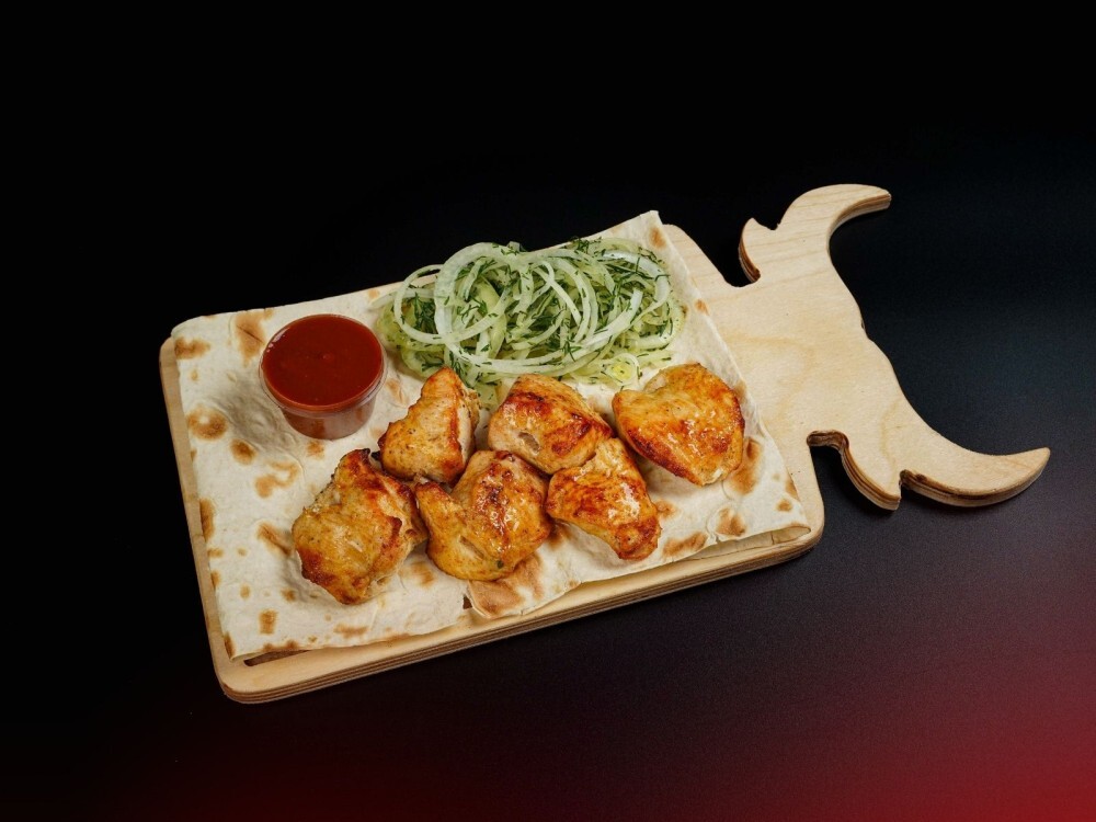 Сочное куриное филе, маринованное в ароматных специях, приготовленное на огне и поданное с пикантным соусом, хрустящим луком и нежным лавашом.