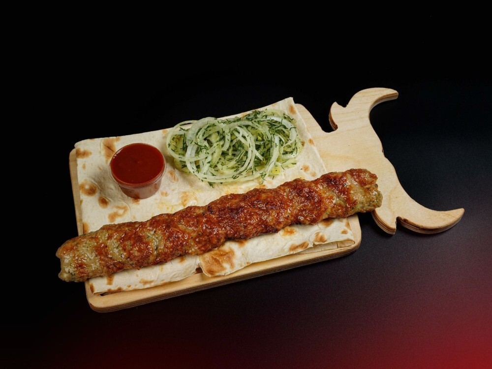 Нежный куриный фарш, маринованный лук и пряный соус в тонком армянском лаваше — попробуйте люля-кебаб из курицы и насладитесь вкусом.