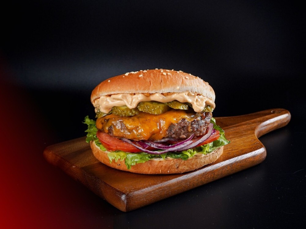 Хотите попробовать наш бургер? Сочная говяжья котлета, обжаренная и положенная между булочек, раскроет свой богатый вкус в сочетании с пряным гриль-соусом, красным луком, хрустящими листьями салата и сочными маринованными огурцами. Завершает картину тягучий сыр чеддер.