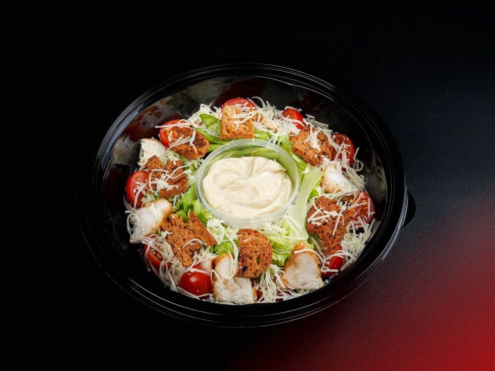 Ищете сытное и полезное блюдо на ланч? Предлагаем вам попробовать наш салат, в который мы добавляем обжаренное куриное филе, сочные помидоры черри, хрустящий салат айсберг, аппетитные сухари и тёртый пармезан, а заправляем всё это фирменным соусом