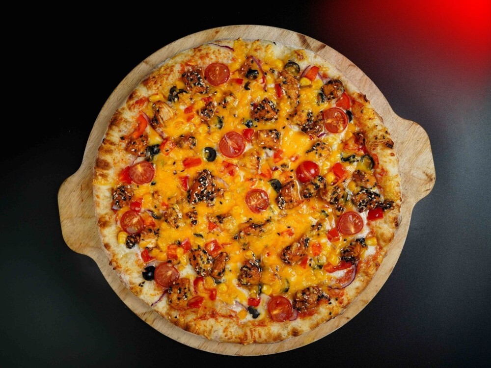 От Шефа – это фирменная пицца в состав которого входят: курочка терияки, сыр моцарелла, кукуруза, помидоры черри, болгарский перец, красный лук, маслины, кунжут, соус и тесто. Попробуйте пиццу от шефа и убедитесь, что она идеальна для любого случая!