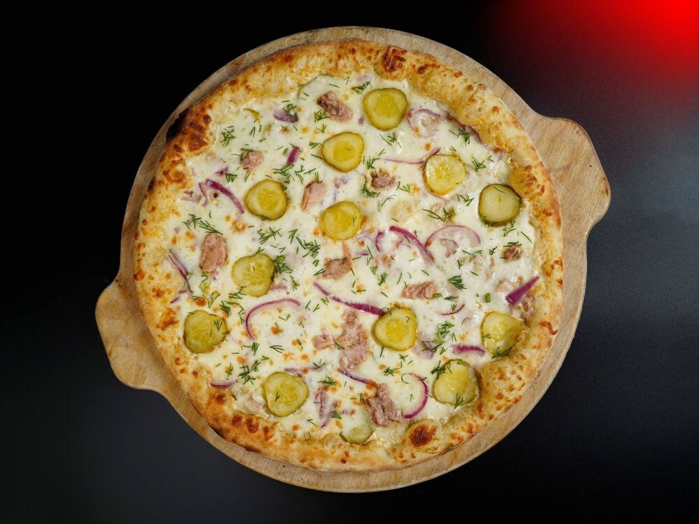 Эта пицца из категории настоящих итальянских блюд. В ней сочетаются аппетитная моцарелла и пармезан, ароматный красный лук, пикантные маринованные огурцы, а также консервированный тунец и сливочно-чесночный соус.